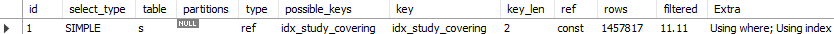 -> Covering index lookup on s using idx_study_covering (category='IT') (cost=198424 rows=1.46e+6) (actual time=0.184..482 rows=500000 loops=1)